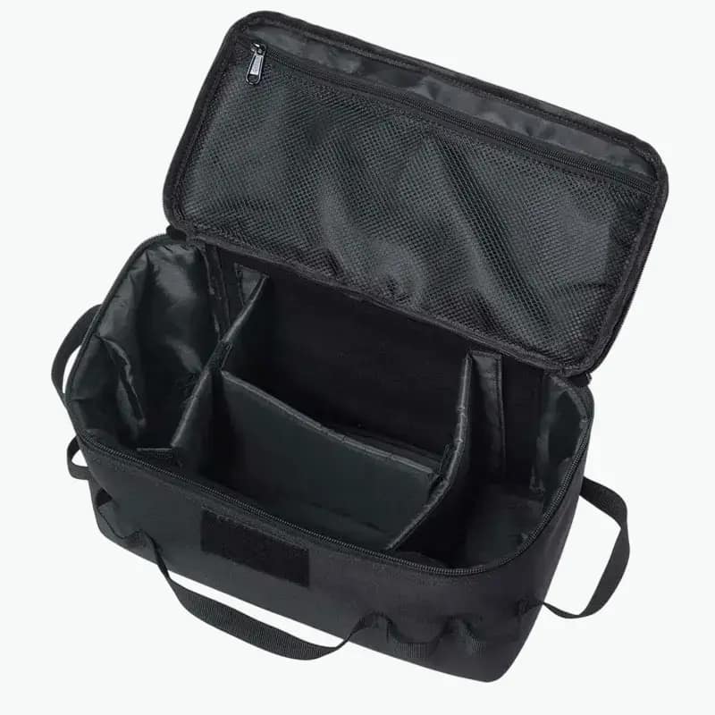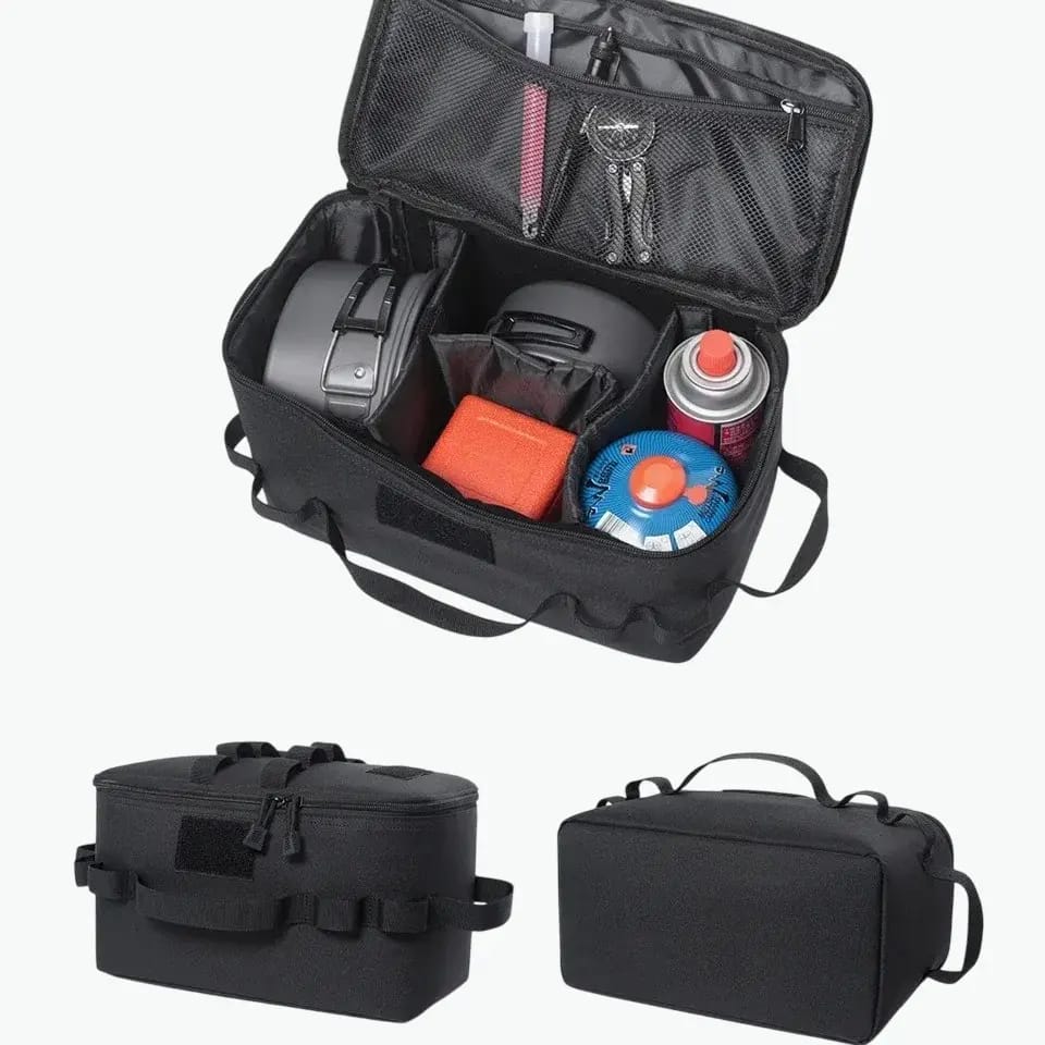 Made from high-density waterproof Oxford fabric, the reinforced structure provides durability, protection, and easy transport. The spacious main compartment and adjustable dividers help organize stoves, pots, utensils, and coffee accessories with precision. Therefore, it is ideal for outdoor enthusiasts who value convenience and quality.