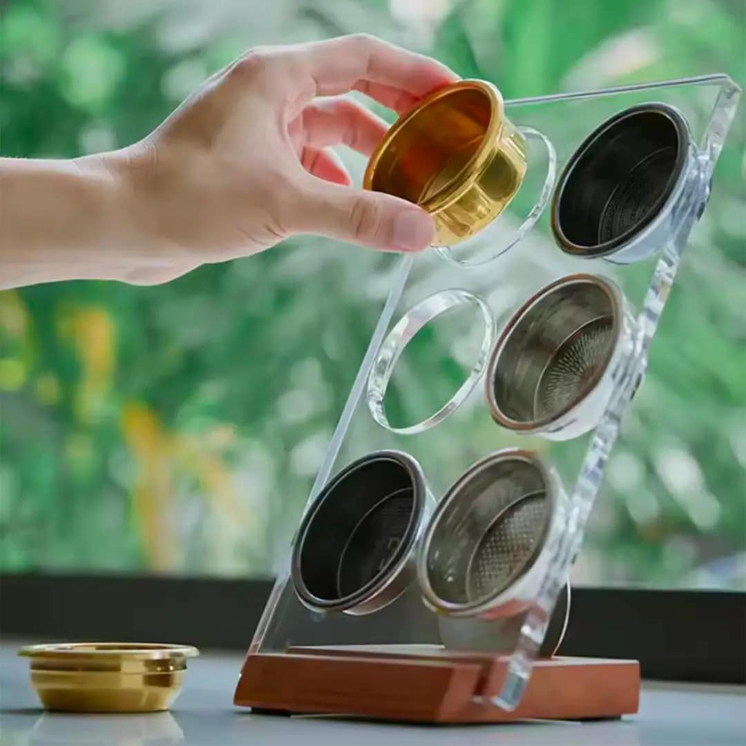 Coffee Basket Holder for espresso machines. Keeps portafilters organized and stable, ideal for home baristas and professional café use.
