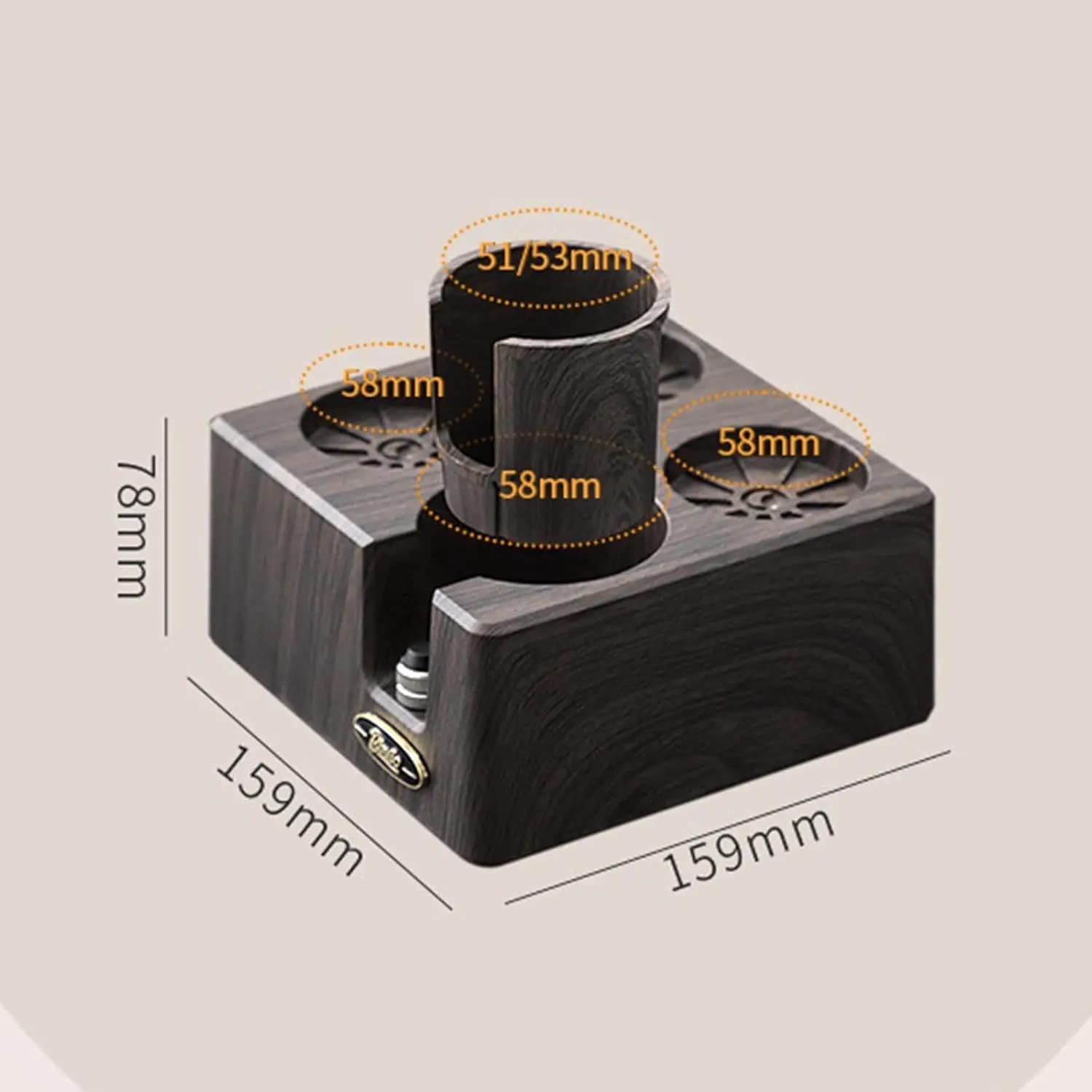Coffee tamper mat stand with adjustable height and stable design, compatible with 51mm, 53mm, and 58mm espresso handles for home and café use.