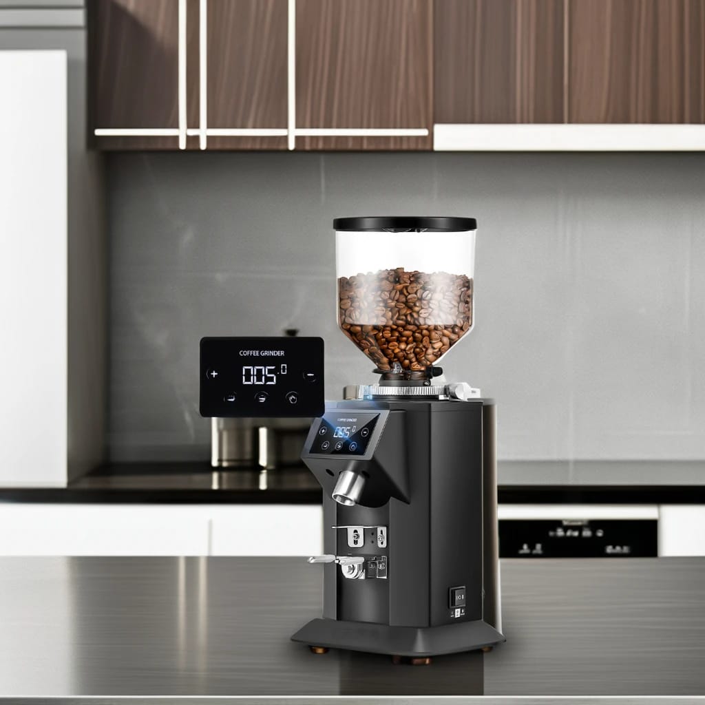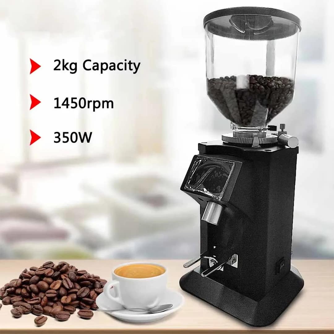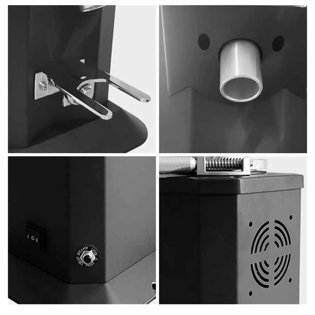 The grinder comes with a 1500-gram hopper and integrated cooling fans, making it ideal for high-volume commercial use. The cooling system prevents overheating during extended grinding sessions, maintaining performance and reliability.