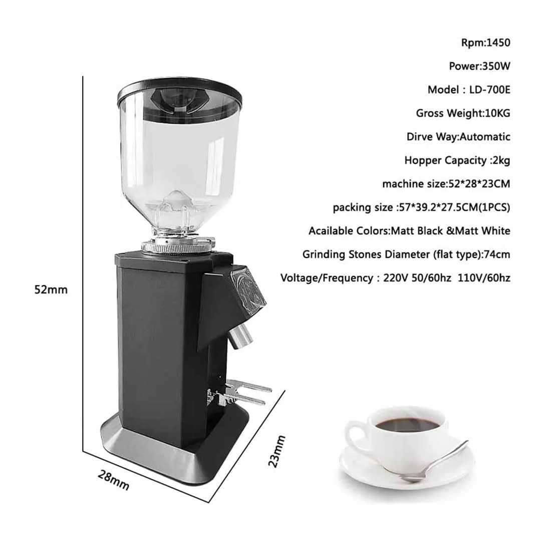 Grind coffee quickly and precisely with the E700 Grinder, featuring a 74mm stainless steel gear, 1400 RPM motor, and 1500g hopper with cooling fans, ideal for home or commercial use.