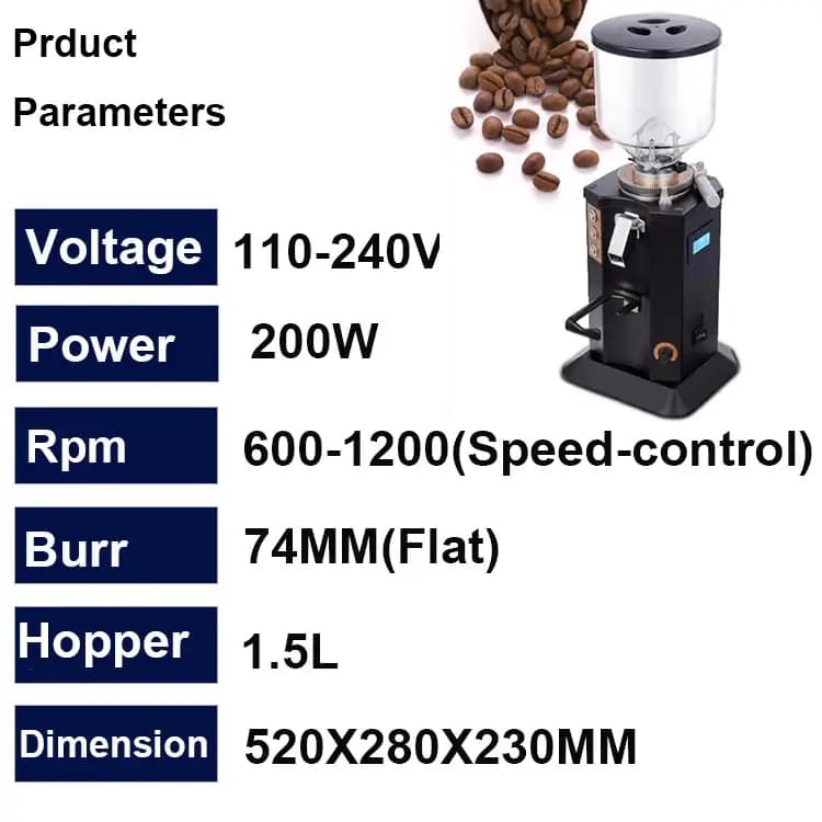 Powered by a 350W motor running at 1450 RPM, the GF74 ensures efficient grinding with minimal heat buildup, preserving the natural aroma and oils of your coffee beans. The large 1.5L hopper capacity allows for continuous operation, making it ideal for high-demand environments.