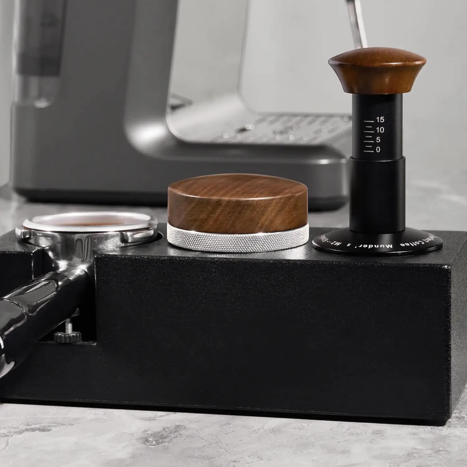 MUVNA 58mm Espresso Distributor with walnut handle and stainless steel base Adjustable height for even powder distribution, ergonomic and durable for home or café use.