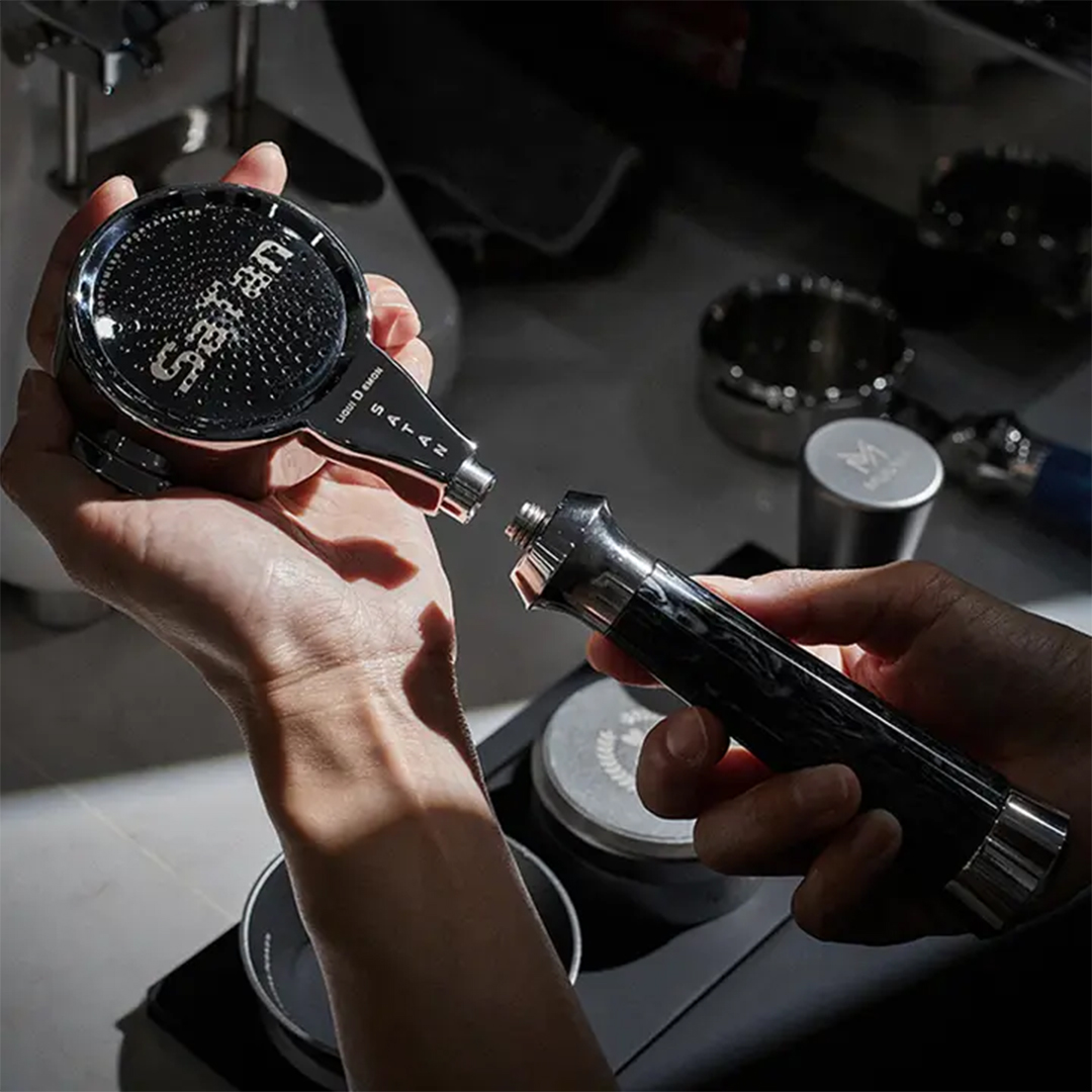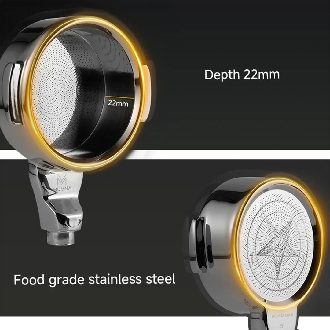 Built with a high-quality stainless steel head and a sleek black ergonomic handle, the Muvna portafilter provides excellent balance and heat stability. Its solid construction helps maintain consistent water flow through the coffee puck, resulting in richer flavor and improved crema.