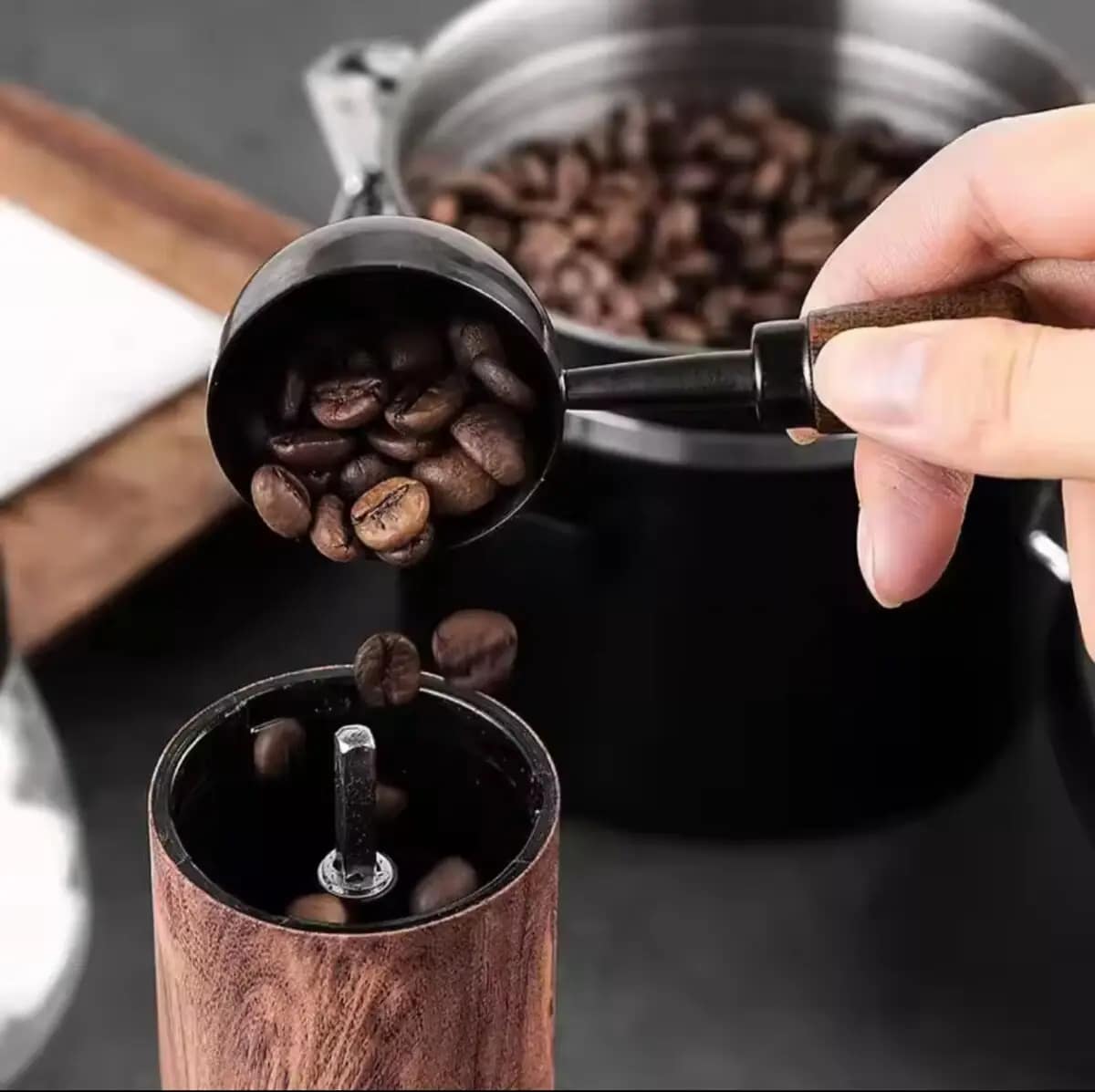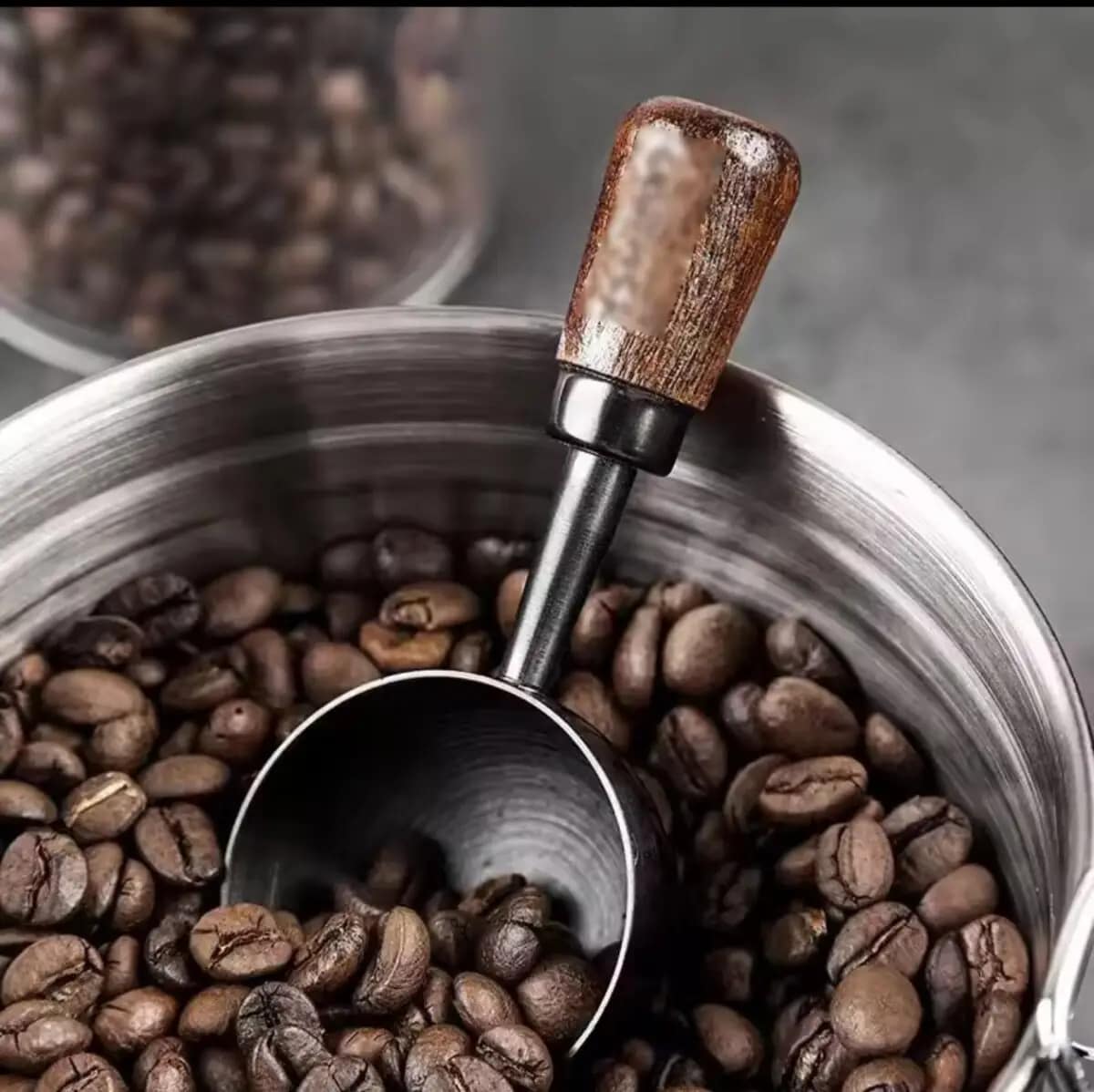 Elegant stainless steel coffee measuring spoon with durable walnut handle. Perfect for coffee, tea, blending, and as a gift for coffee lovers.